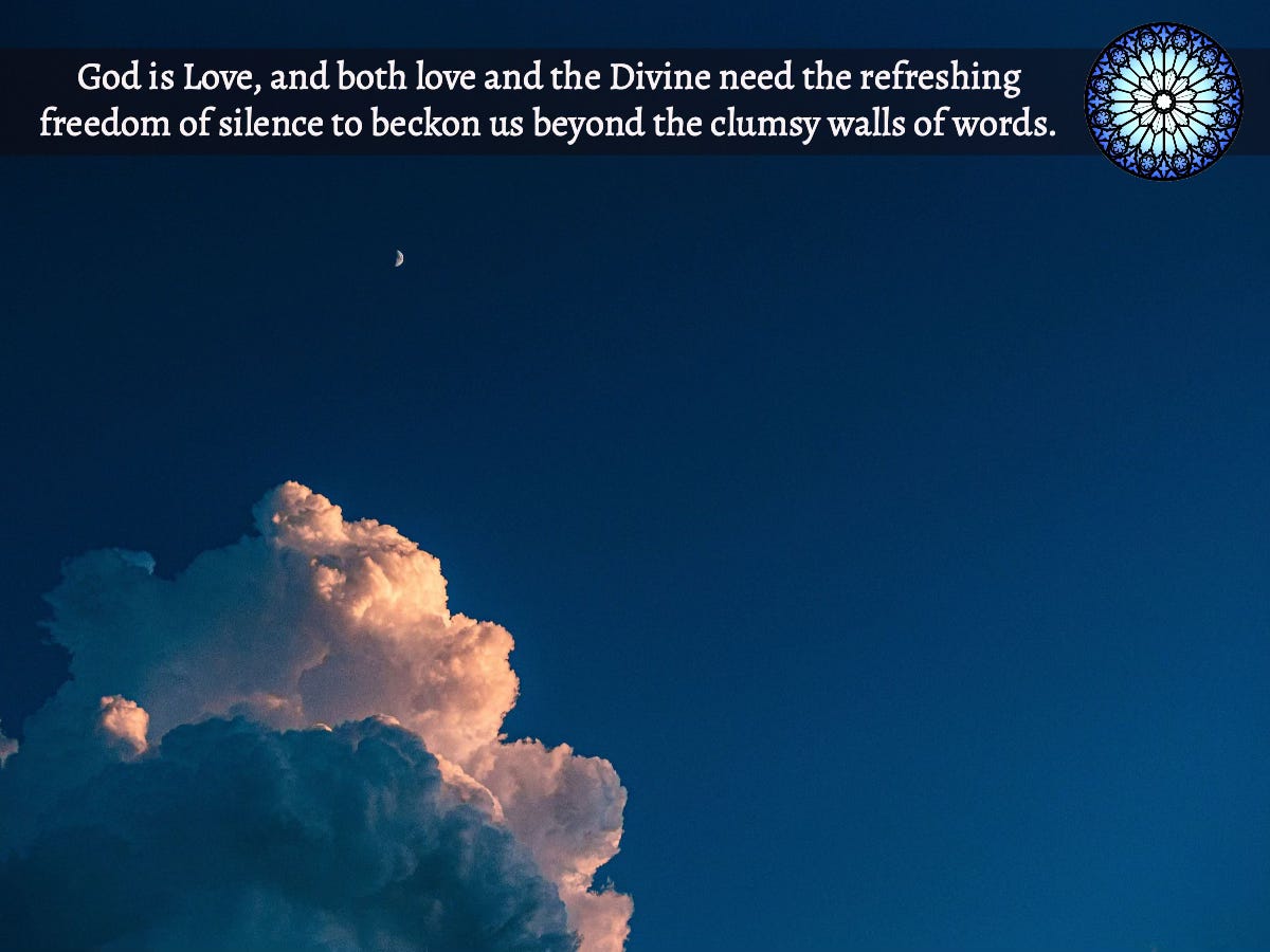 We will not stop talking about God or the Divine any more than we will cease to speak of love. But God is Love, and both love and the Divine need the refreshing freedom of silence to beckon us beyond the clumsy walls of words. May we be faithful to that liberating quiet that lives humbly between every thought and every heartbeat.
