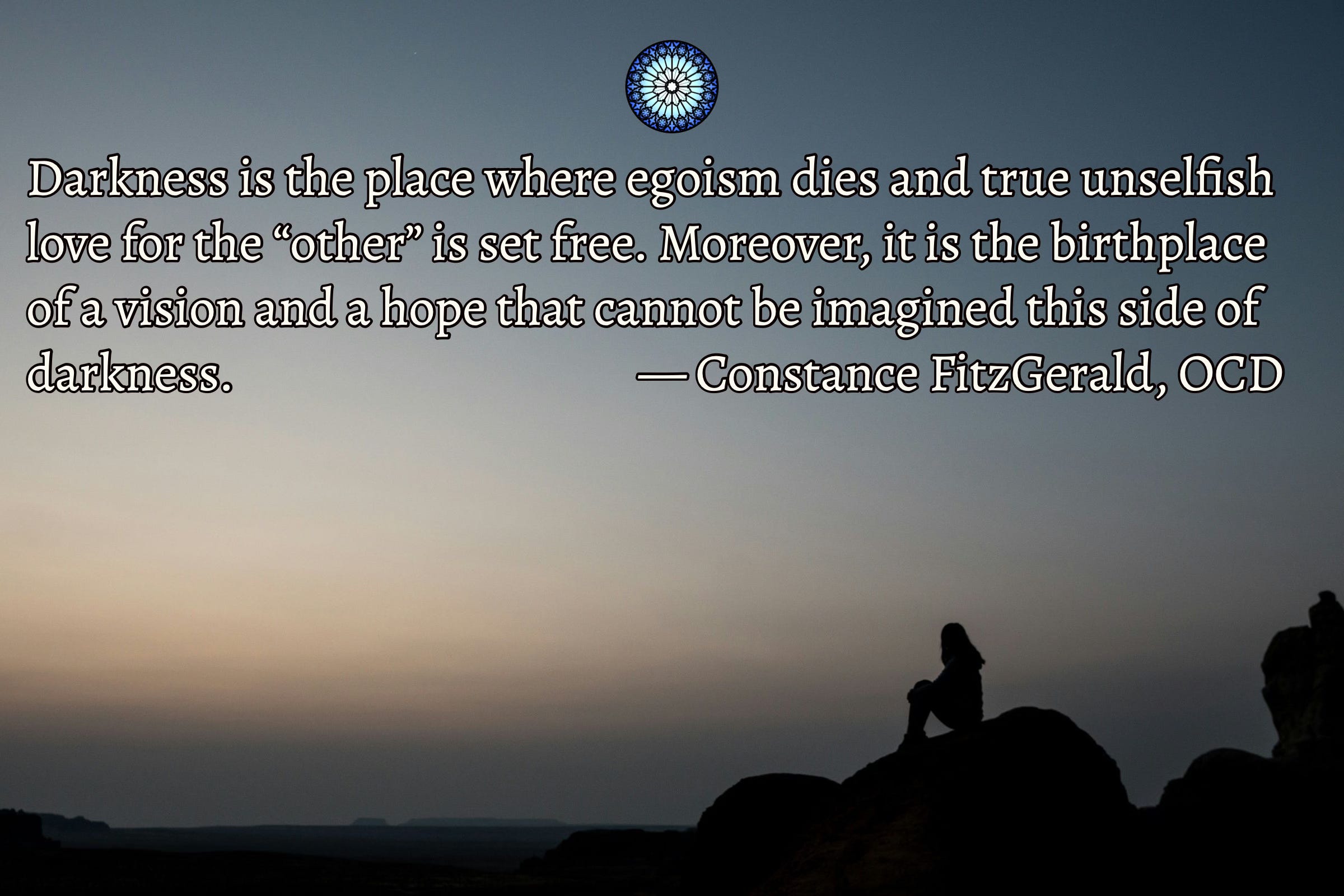 Darkness is the place where egoism dies and true unselfish love for the “other” is set free. Moreover, it is the birthplace of a vision and a hope that cannot be imagined this side of darkness. — Constance FitzGerald, OCD, “Impasse and Dark Night”