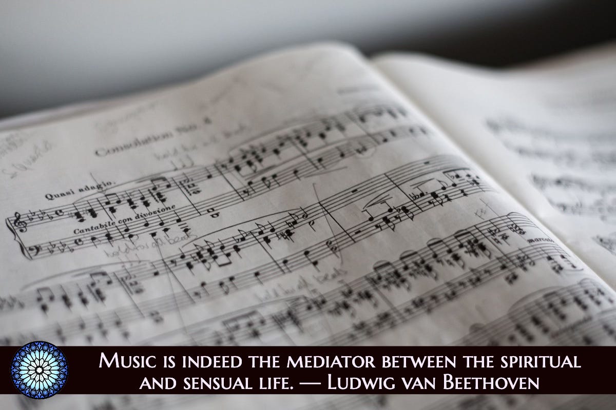His comment about the spiritual and sensual dimensions of life, found in a letter written to Goethe by their mutual friend Bettina von Arnim, could easily be read as suggesting kind of dualistic way of seeing things. But in music, Beethoven finds the key to nonduality, even if he would have been unfamiliar with that term. Music not only “mediates” between the earthly and heavenly realms of our experience, but it invites us to experience the essential unity hidden in the encounter between the ethereal and the physical realms of experience. Music literally makes the spiritual and the sensual one.
