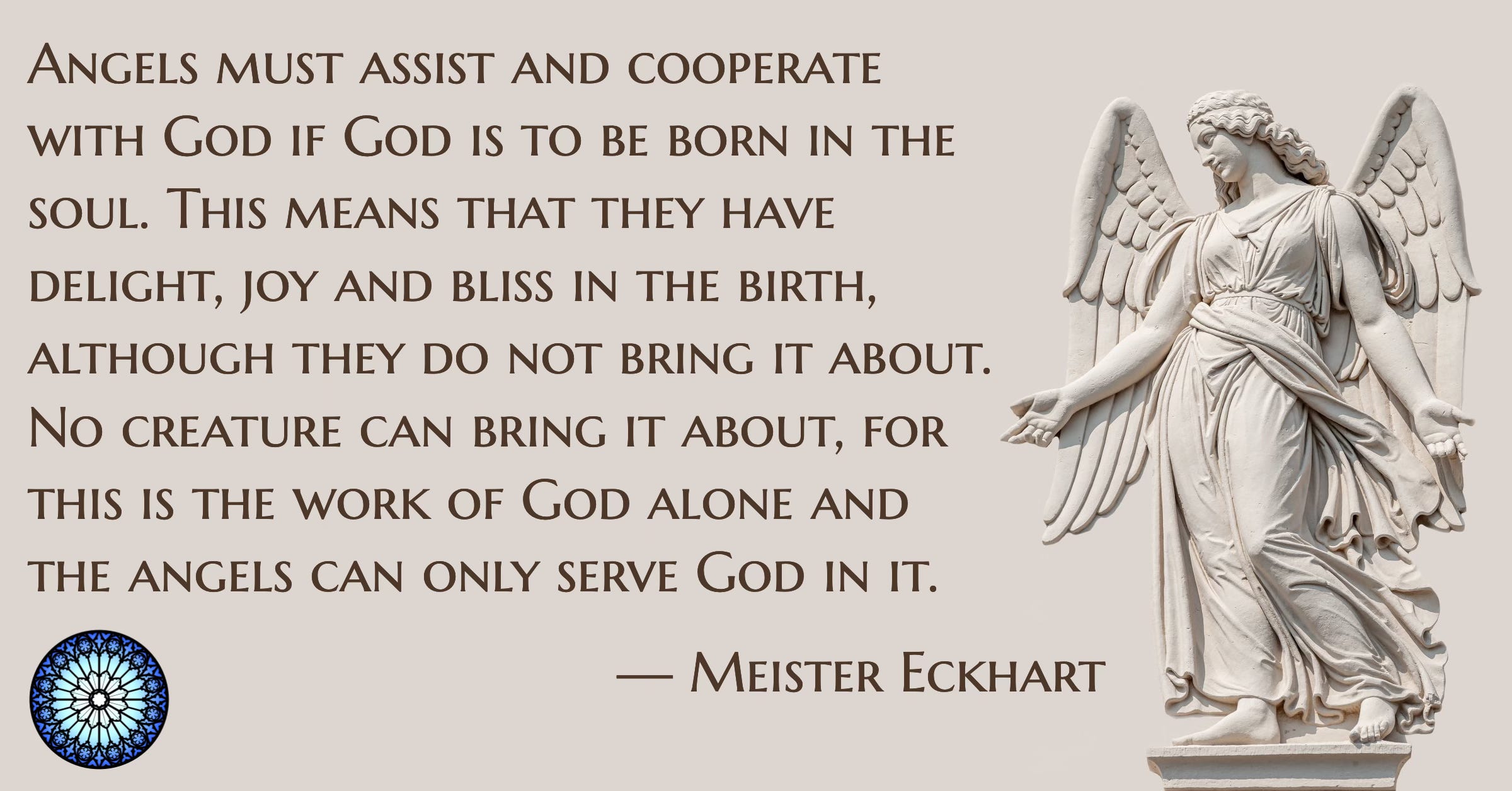But however exalted they may be, this whole host of angels must assist and cooperate with God if God is to be born in the soul. This means that they have delight, joy and bliss in the birth, although they do not bring it about. No creature can bring it about, for this is the work of God alone and the angels can only serve God in it. — Meister Eckart, Se…
