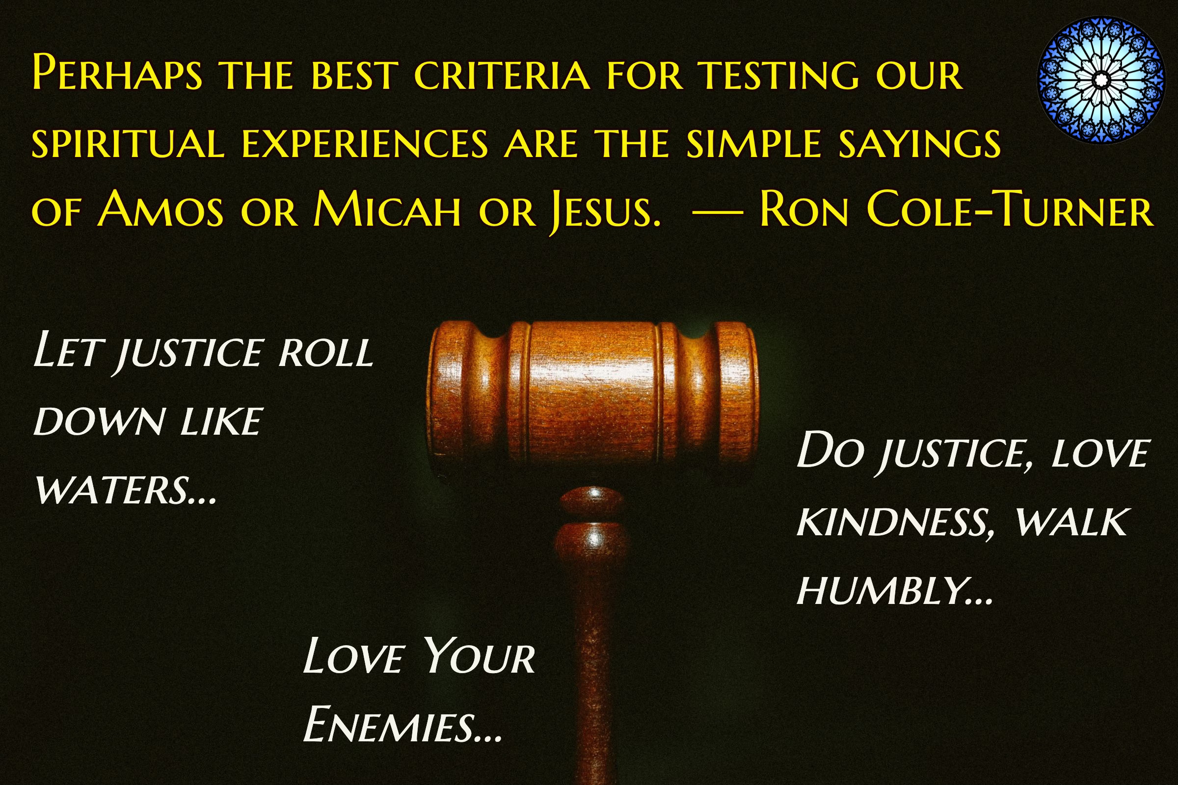 Perhaps the best criteria for testing our spiritual experiences are the simple sayings of Amos or Micah or Jesus. Let justice roll down like waters. Do justice, love kindness, and walk humbly with your God. Love your enemies. — Ron Cole-Turner