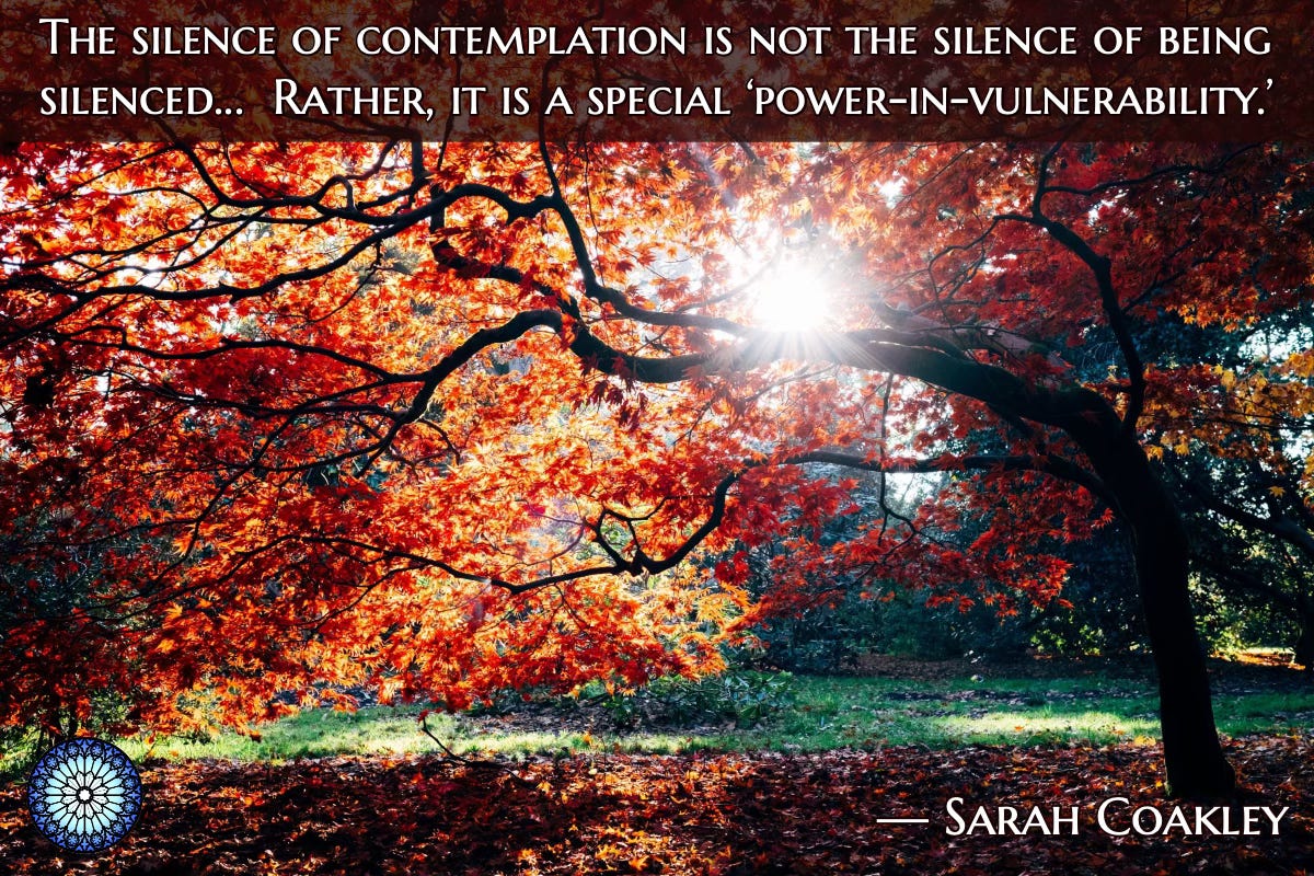 The silence of contemplation is of a particular, sui generis, form: it is not the silence of being silenced. Rather, it is the voluntary silence of attention, transformation, mysterious interconnection, and (in violent, abusive, or oppressive contexts) rightful and divinely empowered resistance: it is a special ‘power-in-vulnerability.’ — Sarah Coakley