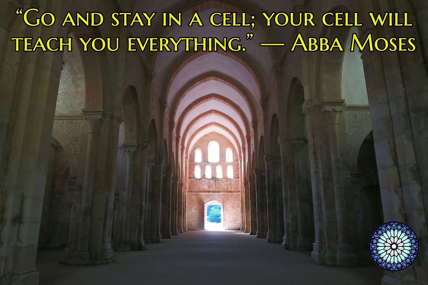 A brother visited Abba Moses at Scete, asking him for a saying. The elder said to him, “Go and stay in a cell; your cell will teach you everything.” — The Book of the Elders: Sayings of the Desert Fathers